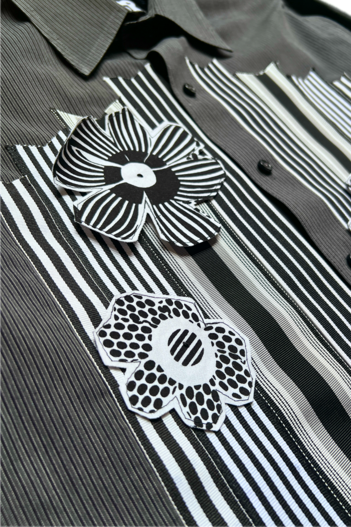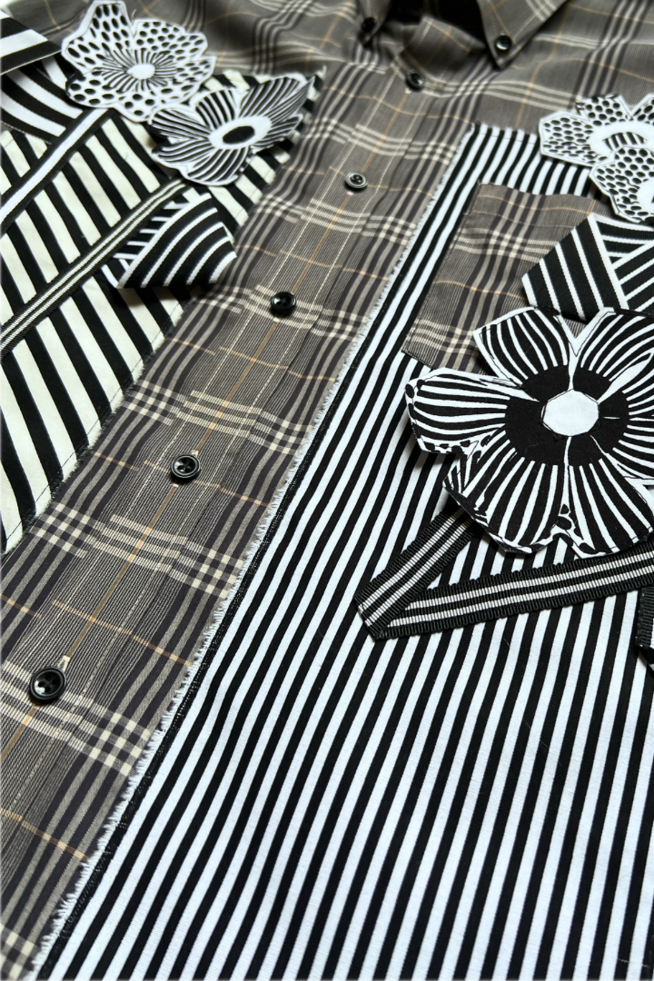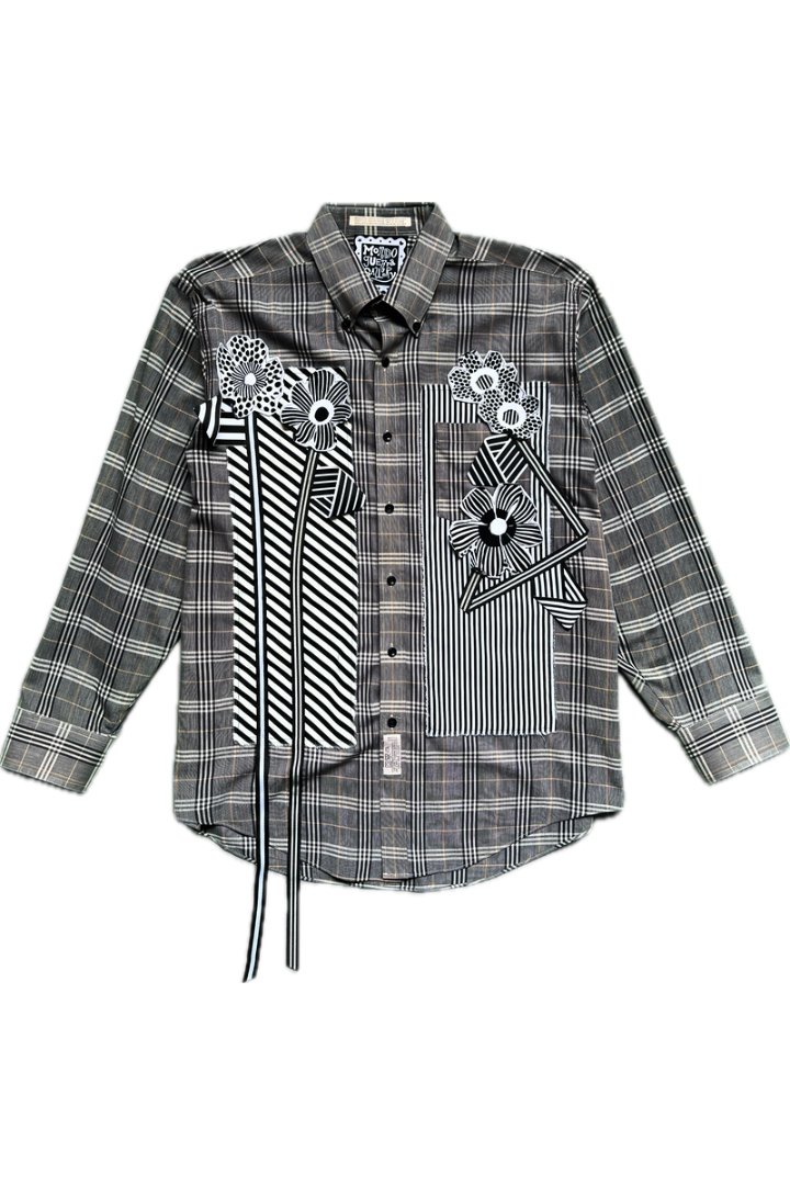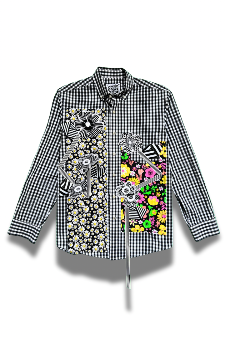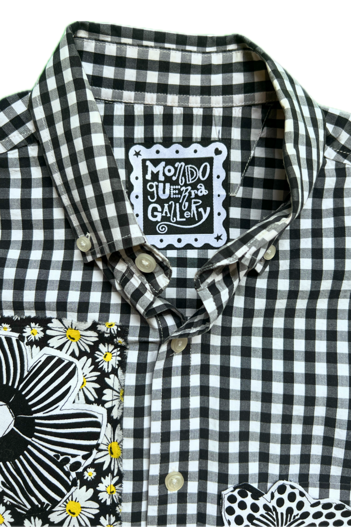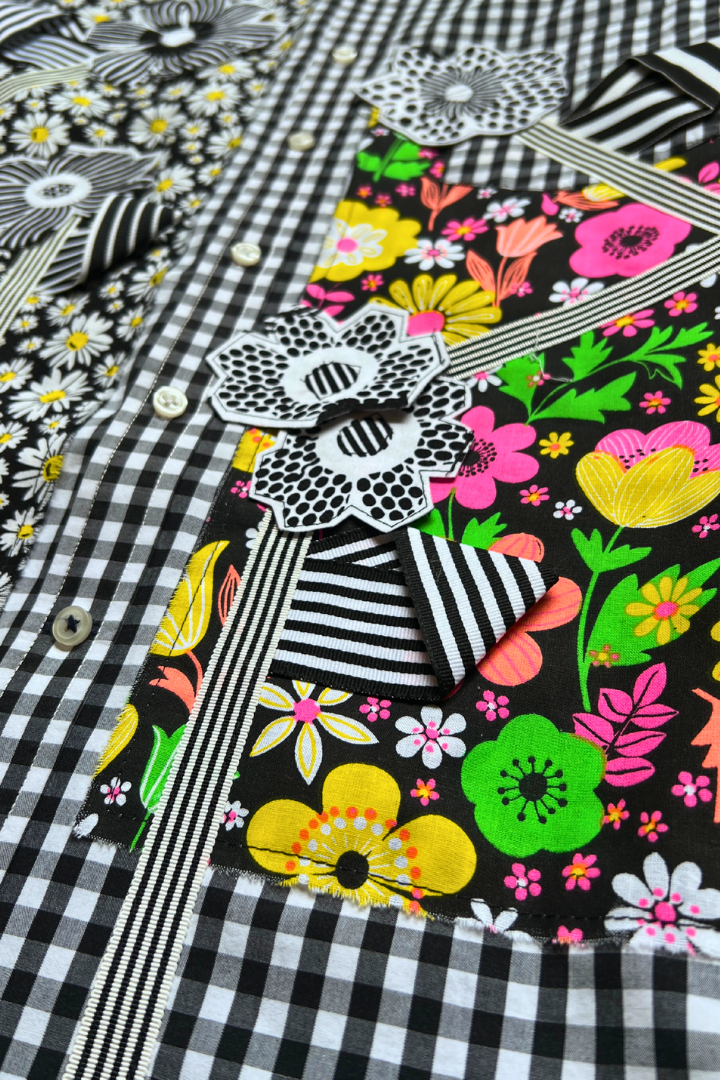 Gallery Pocket Shirt – Black & White Checker with Neon Flower Appliqué